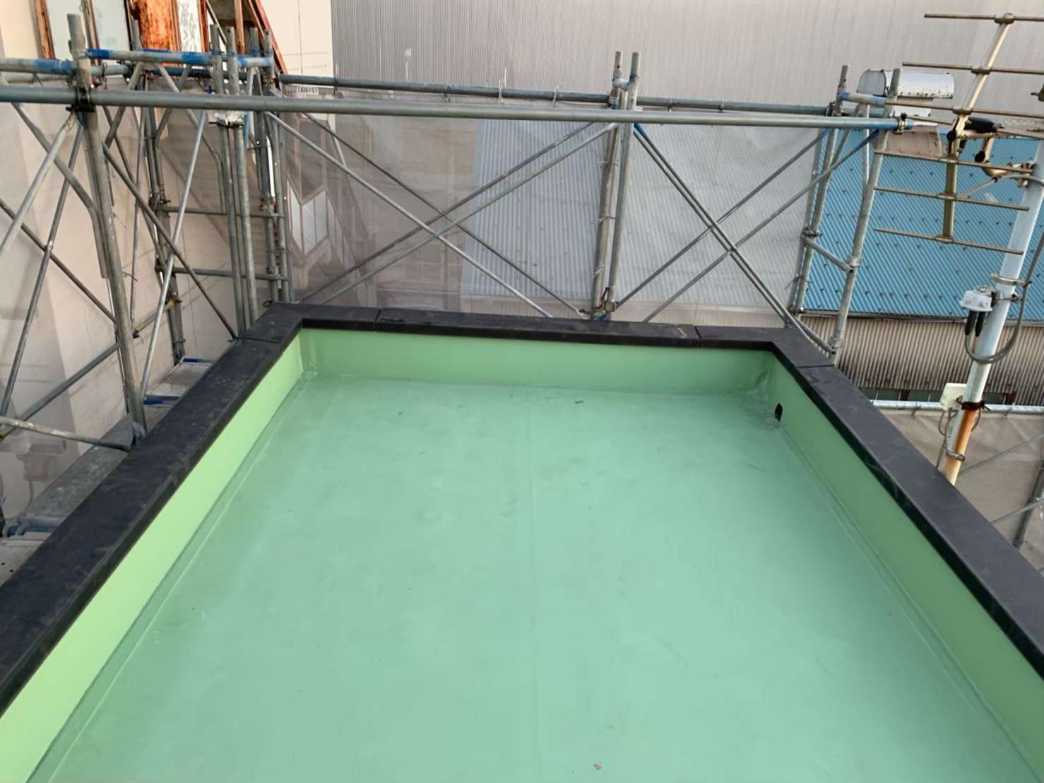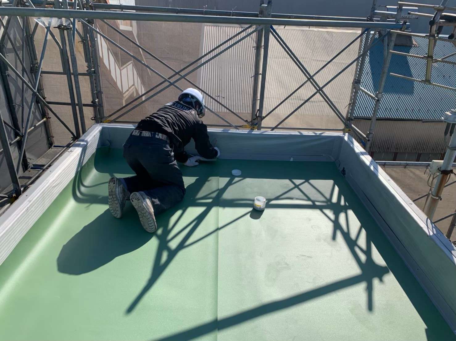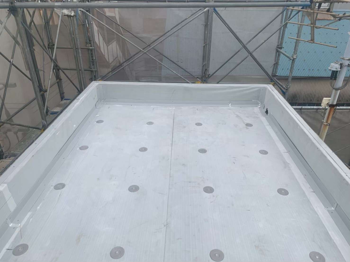 神奈川県川崎市工場・塩ビシート防水工事 2021/04/13 【屋上塩ビシート防水工事】 ~施工内容~ ・ケレン 清掃 ・笠木撤去・復旧 ・立上り・平場 塩ビ鋼板、ディスク取付け ・立上り・平場 塩ビシート張込み ・ドレン設置 ・端末部シーリング処理 ・施工後 施工事例